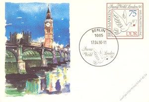 Ausgabeanlass: STAMP WORLD LONDON 1990, links Aquarelldarstellung London Themsebrücke mit Big Ben, Wertstempel: Taube mit Brief