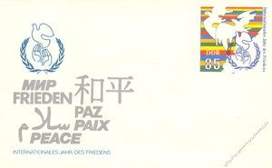 Ausgabeanlass: Internationales Jahr des Friedens auf farbigen Streifen mit UNO-Emblem, links UNO-Emblem und das Wort "Frieden" in ver. Sprachen